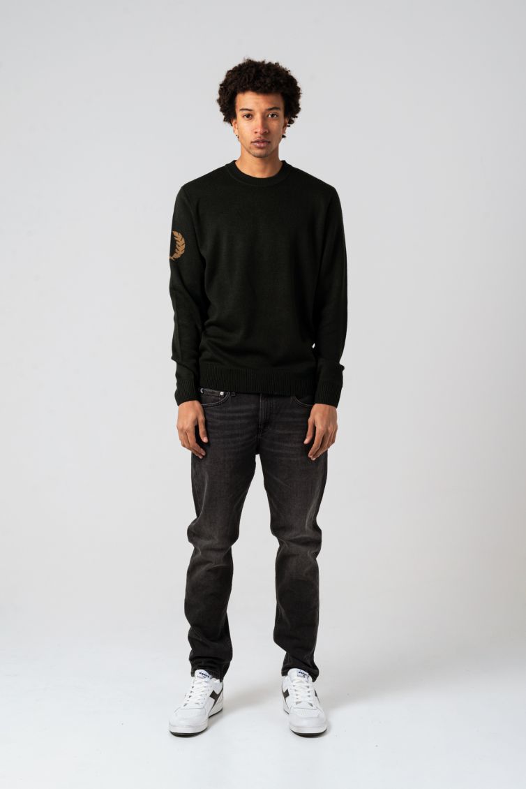E' un maglione a tinta unita color verde notte con l'indistinguibile corona d'alloro ricamata sul braccio sinistro. Il maglione ha colletto, polsini e girovita elasticizzati a costina. E' un modello comodo e caldo, perfetto con questi pantaloni morbidi!