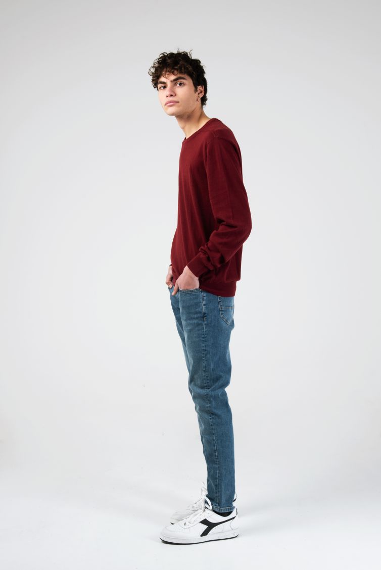 Il maglione da uomo di Guess jeans è un maglione a manica lunga, rosso vino, realizzato in misto cotone.