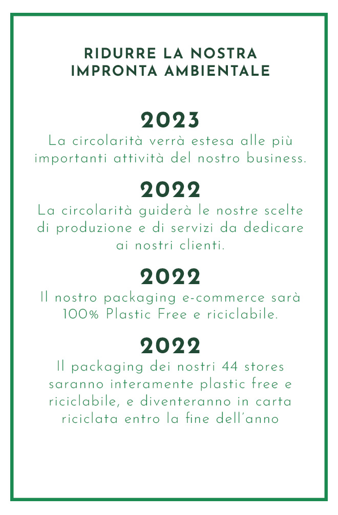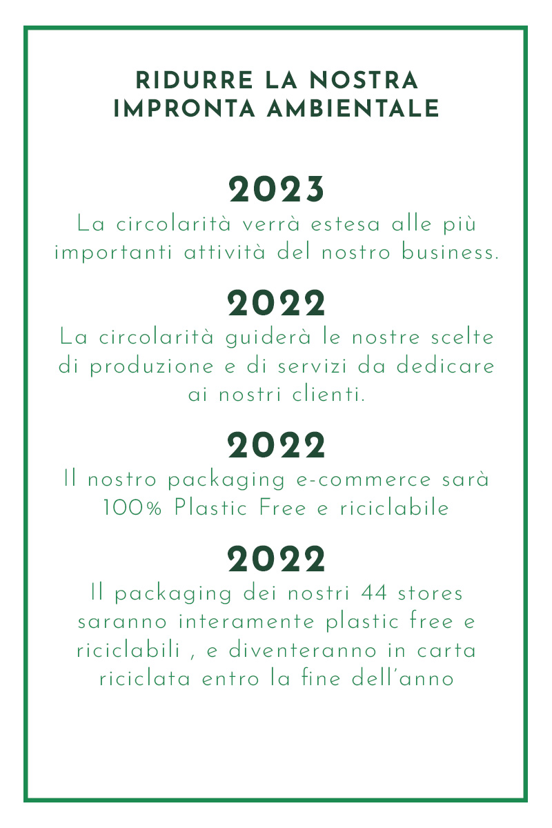 Ricominciamo a respirare: il nostro packaging e-commerce sarà totalmente Plastic Free entro Giungo 2022, il packaging dei nostri store sarà totalmente in carta entro Aprile 2022 ed in carta riciclata entro il mese di Settembre dello stesso anno.