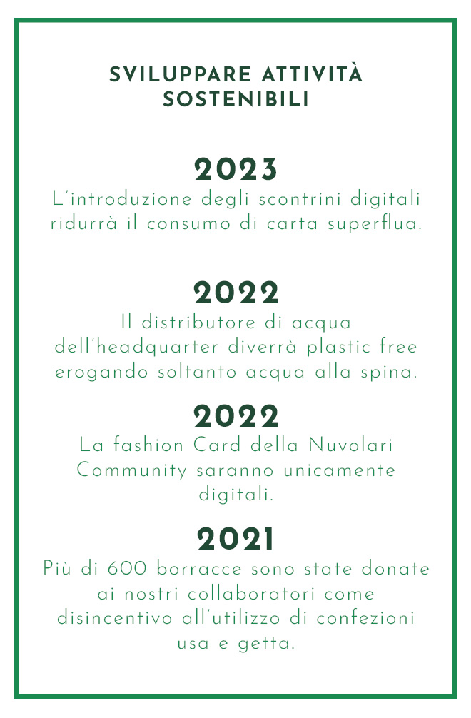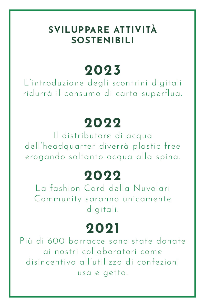 Per questo le nostre attività vedranno nei prossimi anni una graduale conversione globale, con una puntuale selezione dei partner di impresa ed iniziative volte ad includere e coinvolgere i nostri clienti in questo percorso fatto di tappe via via sempre più impegnate e volte a contribuire a rendere la moda uno strumento per costruire un Pianeta che respira e lascia respirare.