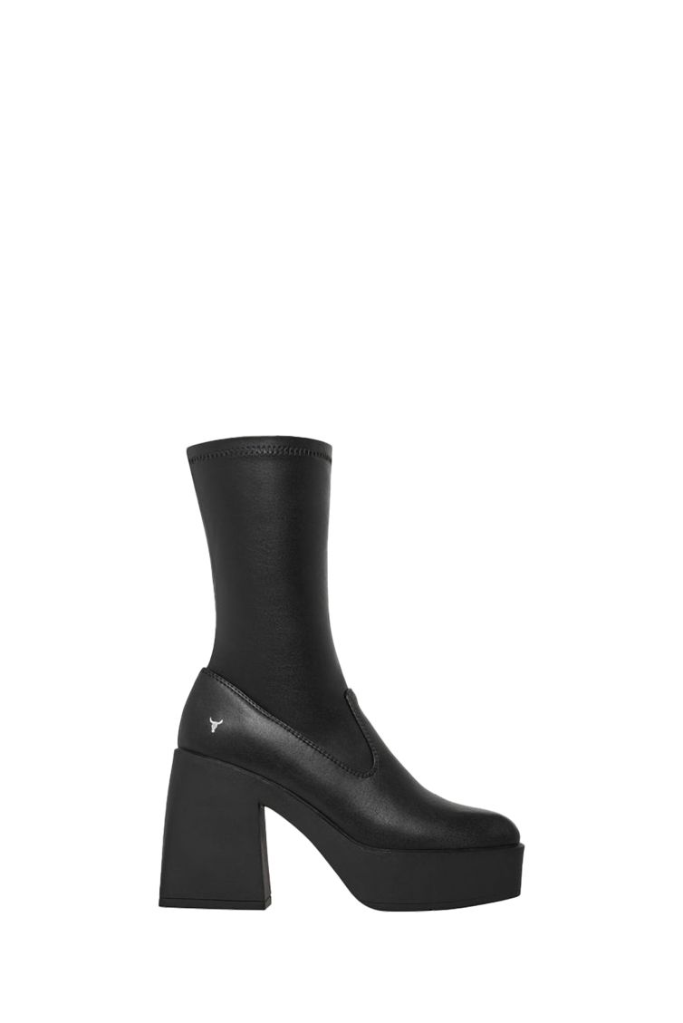 Stivale Windsor Smith nero con plateau, in PU elasticizzato. Altezza del tacco di 11 cm, altezza platform di 4,2 cm